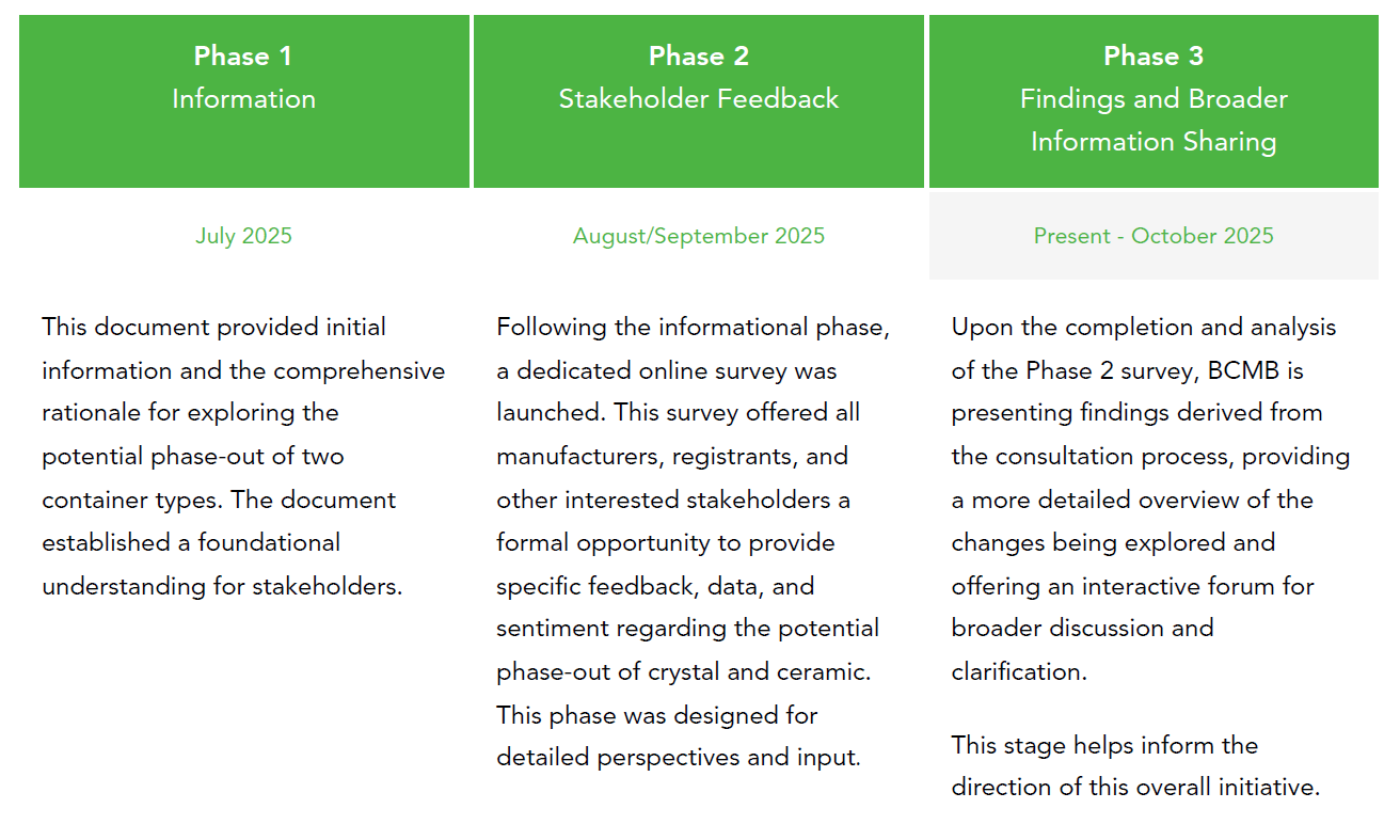 BCMB will continue prioritize direct consultation with key stakeholders, including Alberta’s beverage registrants and collaborate with major industry partners like the Alberta Bottle Depot Association (ABDA) and the Collection System Agent, Alberta Beverage Container Recycling Corporation (ABCRC), to understand the full impact of a potential phase-out.